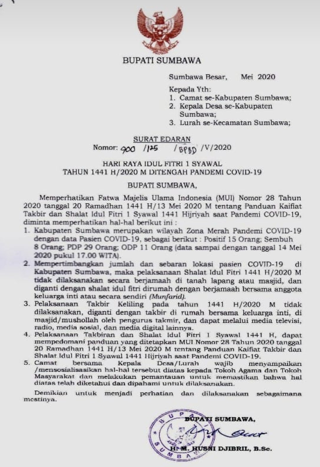 Bupati Sumbawa H M Husni Djibril menerbitkan Surat Edaran (SE) terkait penyelenggaraan Takbiran dan Shalat Idul Fitri 1 Syawal 1441 Hijriah tahun ini. Dalam SE No : 900/125/BPBD/V/2020 yang ditujukan kepada Camat/ Lurah/ Kepala Desa se-Kabupaten Sumbawa itu, Bupati Sumbawa menyebutkan, memperhatikan Fatwa Majelis Ulama Indonesia (MUI) Nomor 28 Tahun 2O2O tanggal 20 Ramadhan 1441 H/13 Mei 2O2O M tentang Panduan Kaifiat Takbir dan Shalat Idul Fitri 1 Svawal 1441 Hijriah saat Pandemi COVID-19, diminta memperhatikan hal-hal berikut ini;